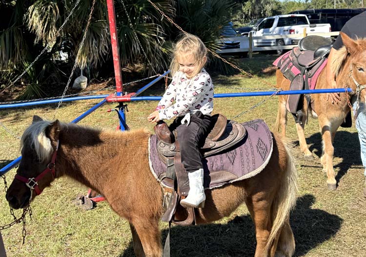 Sporting her fancy cowgirl boots, Macie Caldwell of Live Oak was all smiles as she rode the pony. -SVT Photo