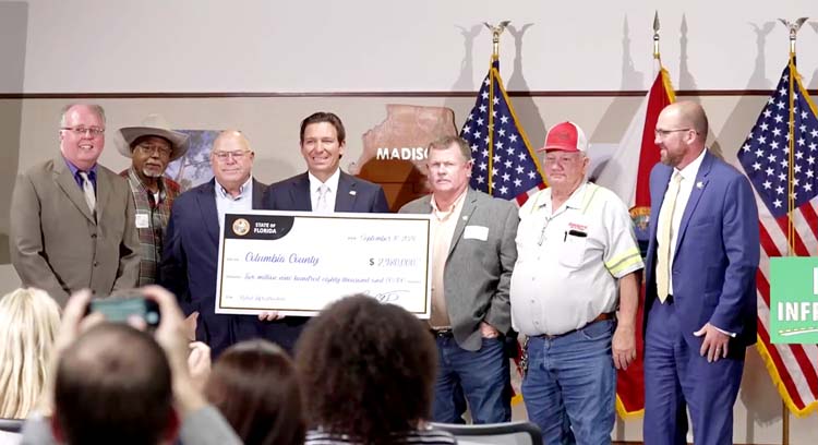 Columbia County officials receiving check from Gov. Ron DeSantis for $2.98M. The funds will go to resurfacing SW Birley Road from CR 242 to CR 252. -Photos Courtesy Governor’s Press