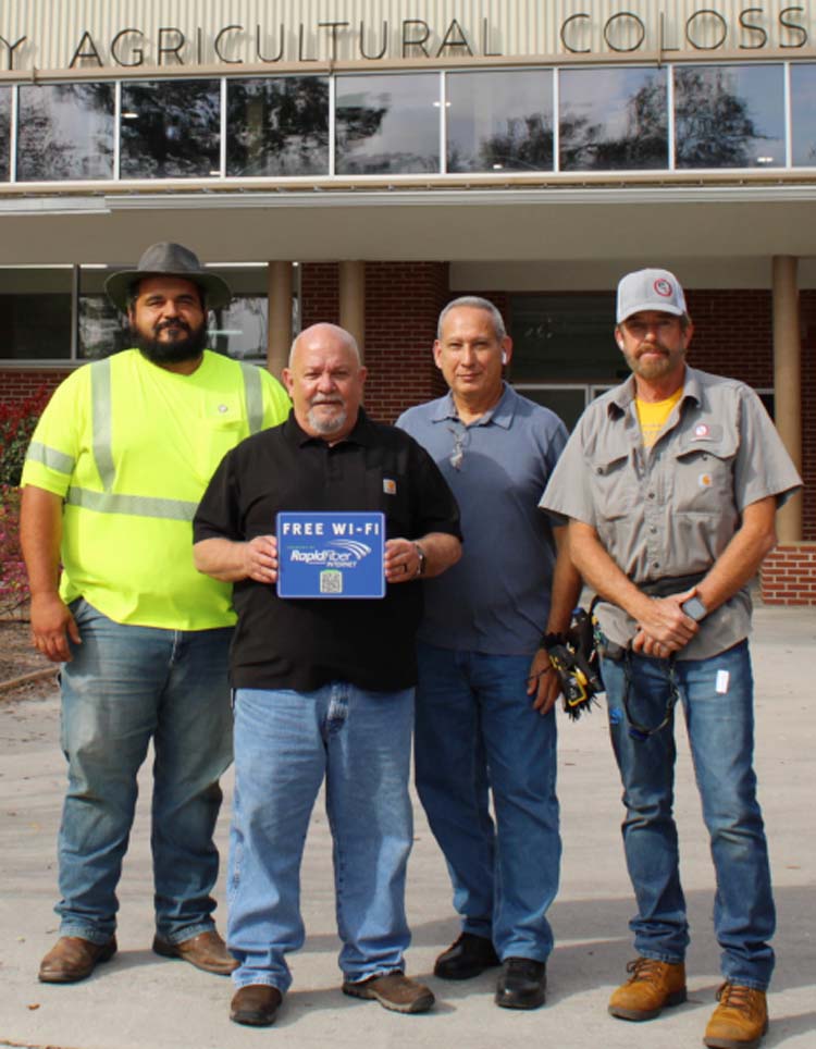 Rapid Fiber Vice President of Network Operations Chris McKenzie, holding sign with installation crew after installing wifi at the Suwannee County Coliseum on February 28. -Photos by Jon Little