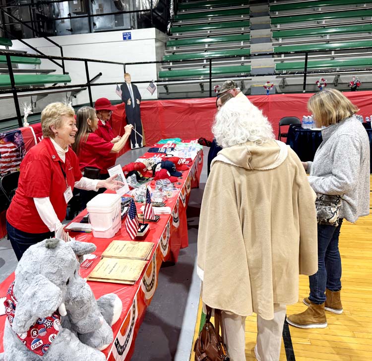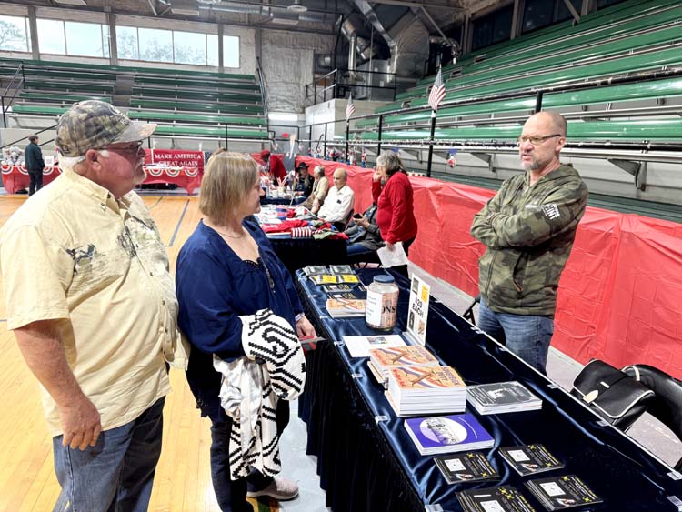 Barbara Gill, left, manning the Suwannee Republican booth and talking with attendees before KrisAnne Hall spoke at the Coliseum last Saturday. -SVT Photo