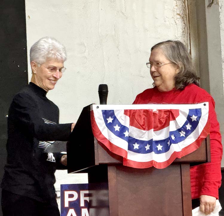 American Patriots of Live Oak’s outgoing president Donna Long, left, receiving an award from incoming president Virginia Smith. -SVT Photo