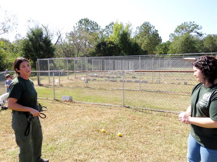 Left, Animal Control Officer Denise Watson talks with Receptionist Miranda Douglas about the dog runs while Wyatt Green, left background, plays with Target. -SVT Photo by Tami Stevenson