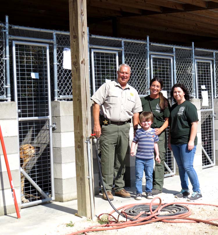 L-R: Sheriff Sam St. John, Animal Control Officer Denise Watson, Receptionist Miranda Douglas and Wyatt Green (center) stand in front of the concrete kennels. -SVT Photo by Tami Stevenson