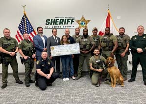 PHOTO: Sen. Tom Wright presents K-9s United board members with a $400,000 state grant, along with St. Johns County Sheriff Robert Hardwick and deputies, Nassau County Sheriff’s Office (with K-9 Patriot) and Jacksonville Sheriff’s Office K-9 units. -Photo: Submitted