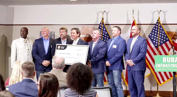 Suwannee County officials receiving check from Gov. Ron DeSantis for $3.66M. The funds will support the widening and resurfacing of CR 250 from 193rd Road to SR 51. -Photos: Governor's Press