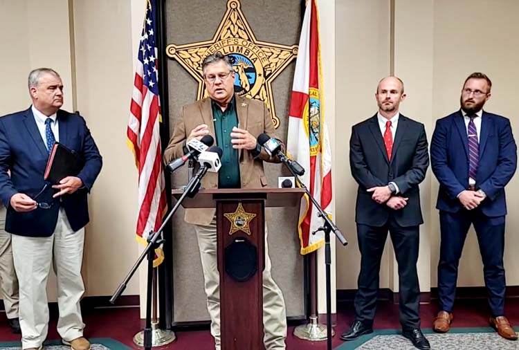 Columbia County Sheriff Mark Hunter talking about what will happen to anyone that makes violent threats on social media during last Wednesday’s press conference. L-R: Columbia County School Superintendent Lex Carswell, Sheriff Hunter, Third Circuit State Attorney John Durrett and Assistant State Attorney Chase Larsen. -CCSO Photo