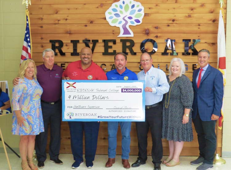 Florida legislators present $4M check to RIVEROAK Technical College. L-R: Karin Hoffman from Key Innovative Solutions, Suwannee County School Board Chairman Jerry Taylor, Senator Corey Simon, State Representative Jason Shoaf, Suwannee County Superintendent Ted Roush, RIVEROAK Principal and Director Mary Keen and former Senator Rene Garcia. -SVT Photo by Tami Stevenson