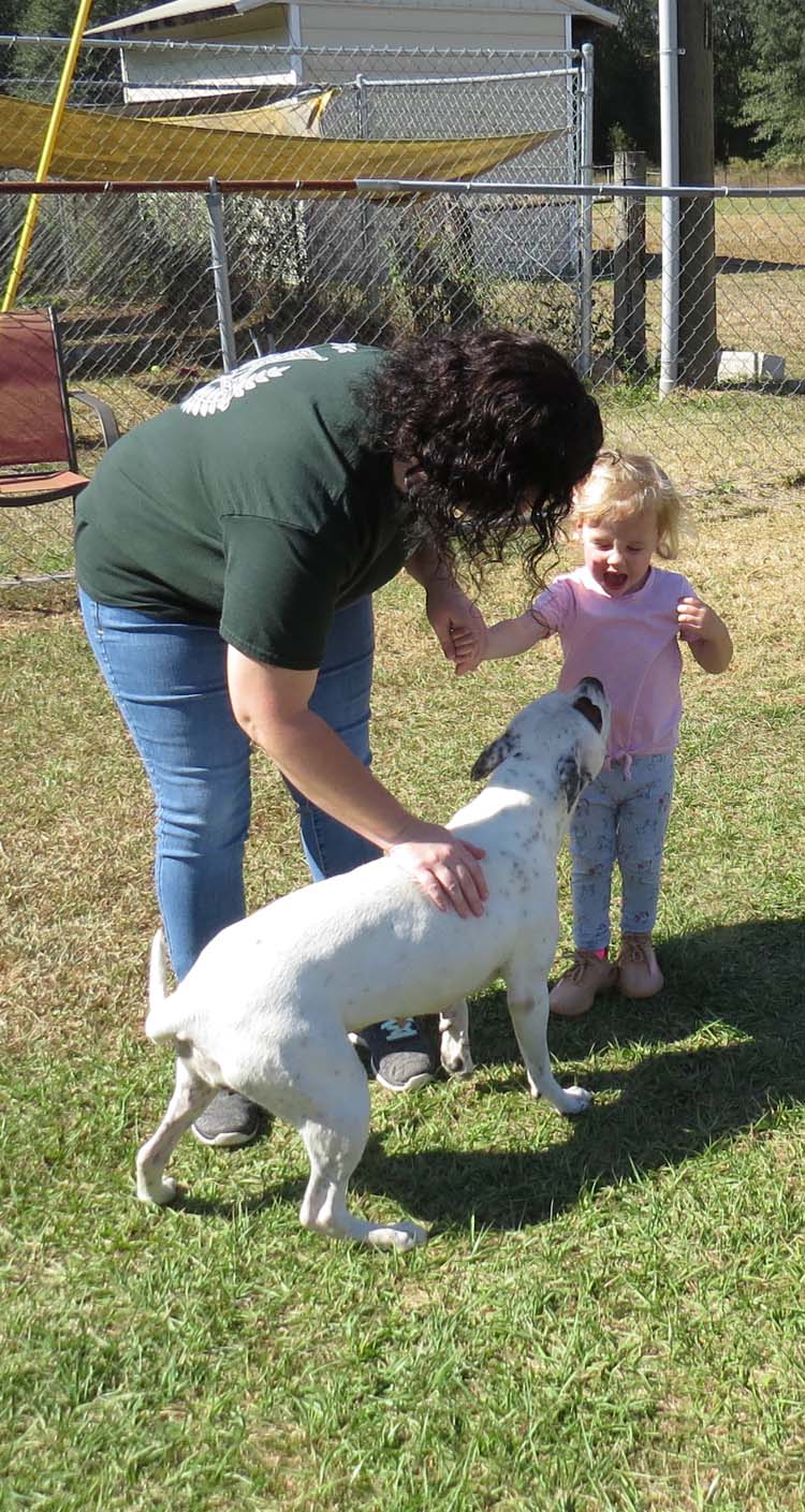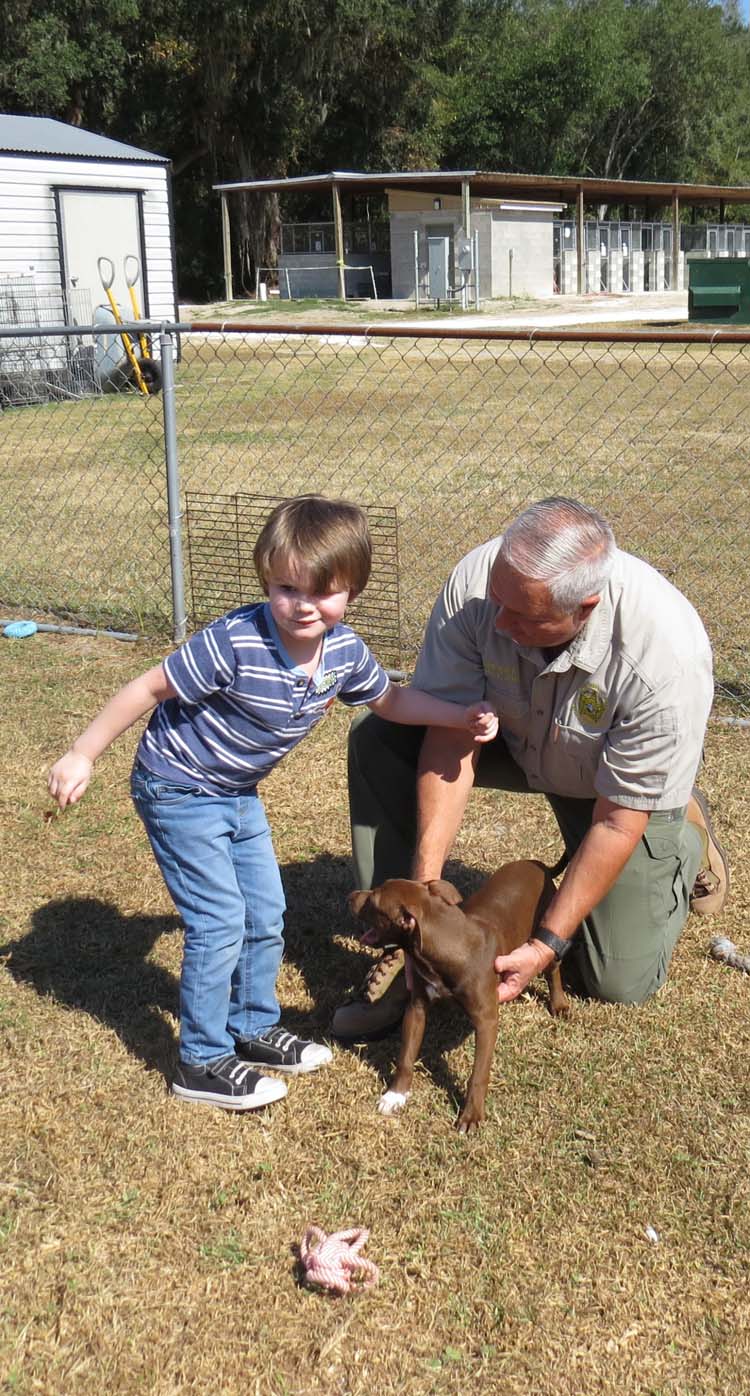 Miranda Douglas introduces one of their longest residents at the shelter, Target, to two-and-a-half year old Blaton. Target was adopted the following week after this photo was taken.