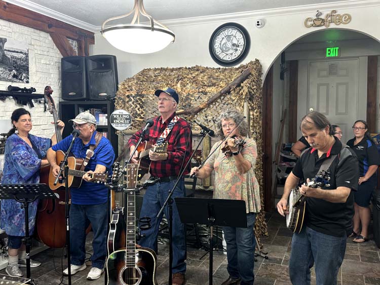 Stagecoach Junction performing at .50 Cal Coffee & Desserts during their grand re-opening last Saturday. L-R: Nancy Grossman, Paul Drummond, Martin Feagle, Lisa Brookins, Danny (Rabbit) Rodgers. Thanksgiving weekend the group will be at the Spirit of the Suwannee for Old Time Farm Days. -SVT Photo