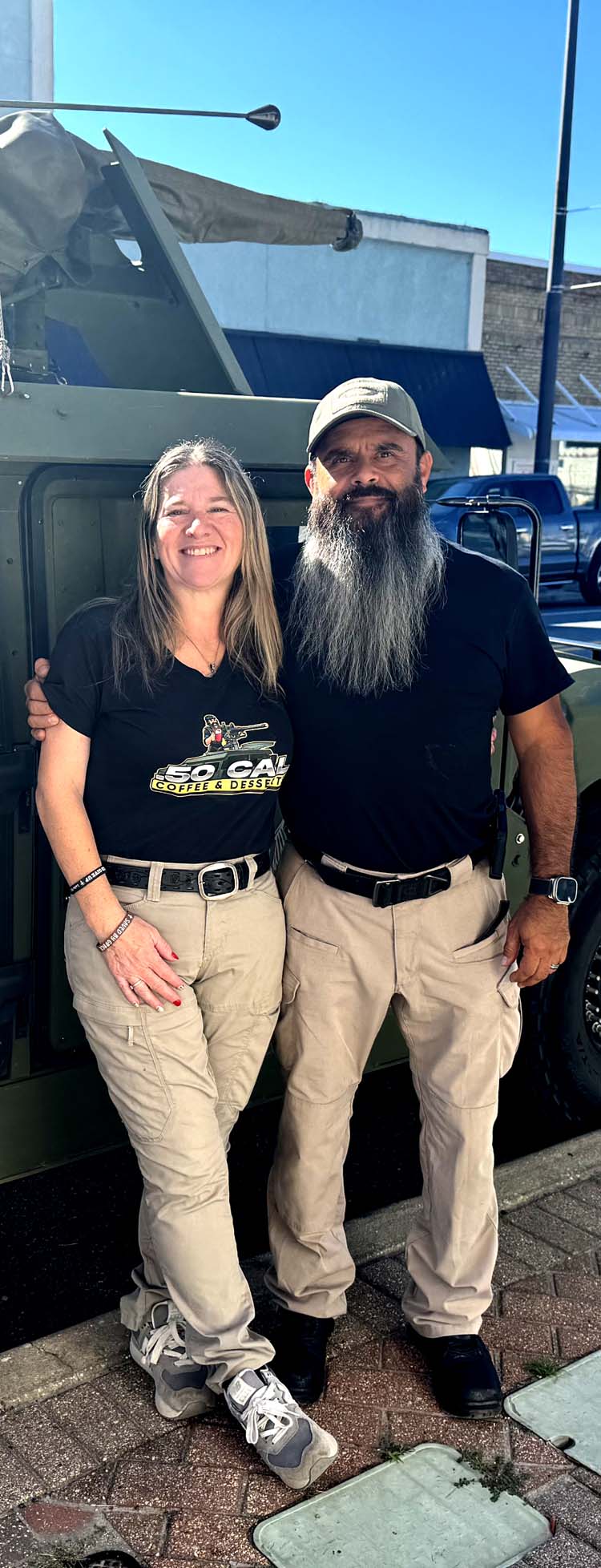 .50 Cal Coffee & Desserts Owners Tammy and Felix Menjivar in front of their Humvee recently mounted with a .50 caliber gun, parked outside the coffee shop during their grand re-opening, Saturday. -SVT Photo