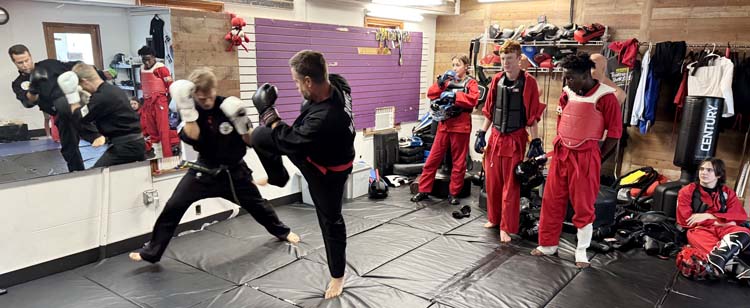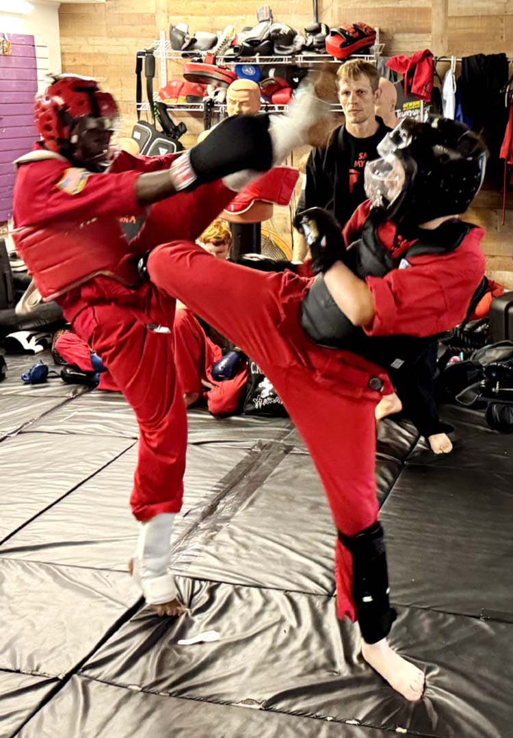 Instructors sparring: Sabonim Randy (RJ) Krueger. left, spars with instructor Marcus Roell as students watch intently. Roell holds a black belt in taekwondo and is currently working to earn a black belt in kickboxing. -SVT Photo