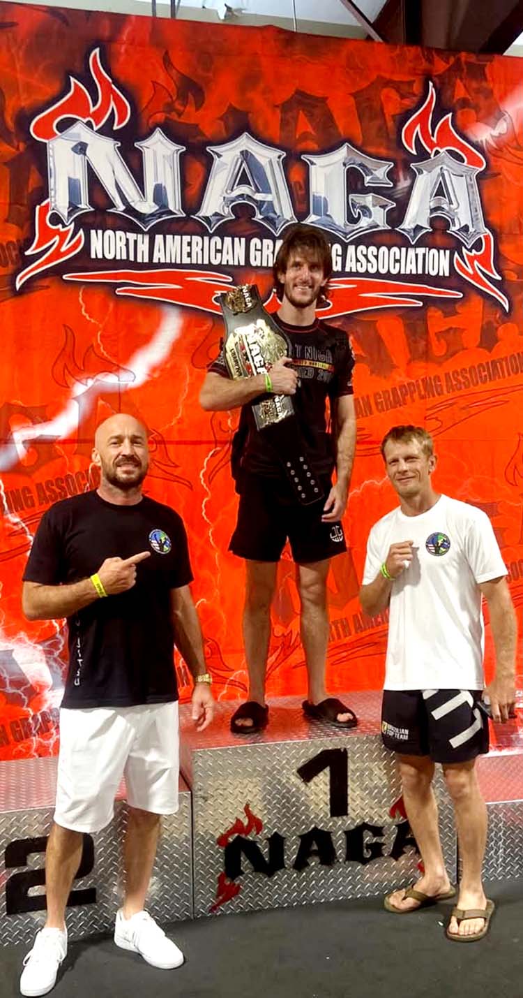 Photo Above : Last weekend Chris Laforte, center, took the covenant belt home during a NAGA competition at the fairgrounds in Orlando. He is a 3-1 MMA fighter who trains with them. Professor Nick Carlucci, left and Sabonim RJ Krueger, right. Photo Below: Krueger took first in Gi for his division, then also took second in Absolute. -Photo: Submitted