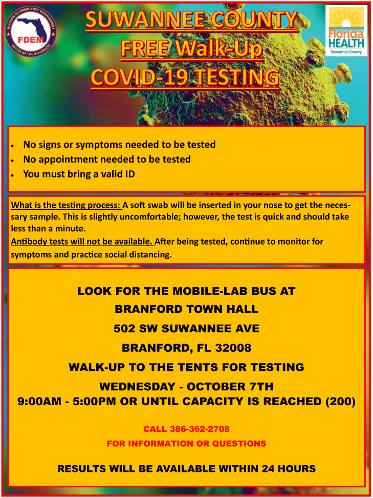 10-1-20 FREE COVID TESTING FOR BRANFORD AND WELLBORN