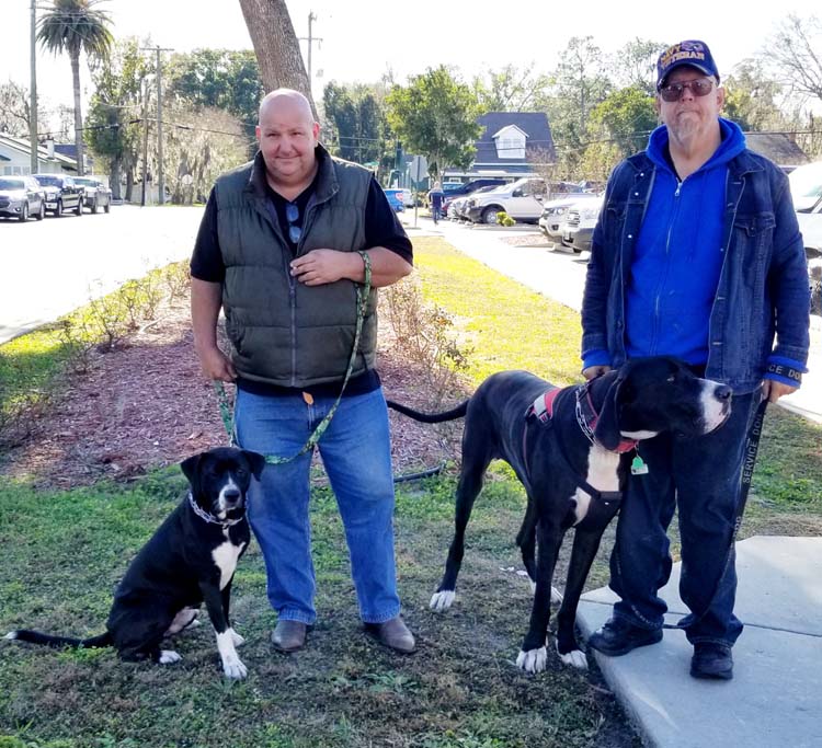 Photo Left: Gunner, a 3 year old European Great Dane service dog, right, graduated from Double Six Service Dogs in Lake City. He, along with owner Mark Strange, is now accompanying Gunner’s buddy, Roscoe, a 6 month old, to meet his teacher, Julie Mandy, who was set up in a booth at Christmas on the Square, to become a service dog as well, for his owner, Tim.