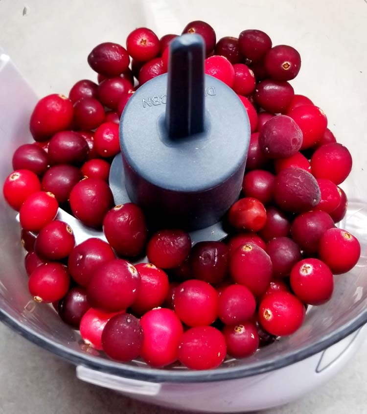 When you are ready to use the frozen cranberries, do not thaw; just wash what you need and put into the food processor.