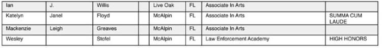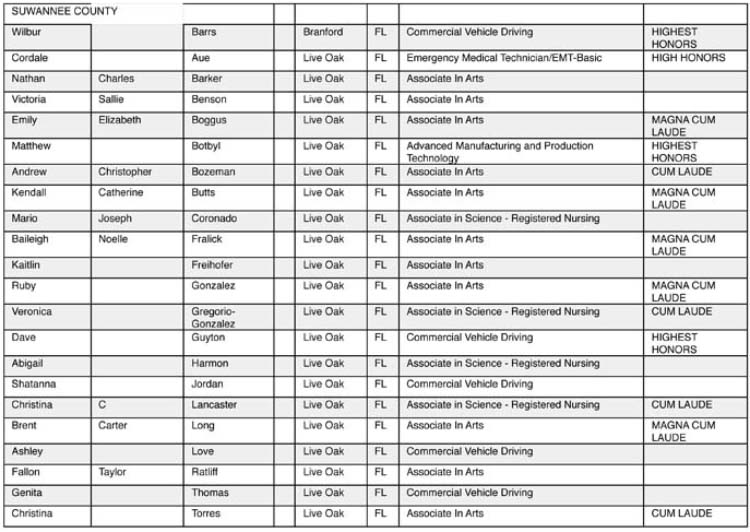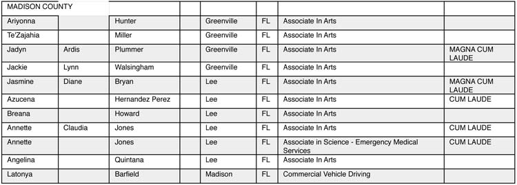 NFC is proud to recognize its Class of 2021 spring graduates and applauds their accomplishments. Thirty-five Madison County students were awarded degrees and certificates at the conclusion of NFC’s Spring Term 2021. Twenty-six Suwannee County students were awarded degrees and certificates and eleven Hamilton County students were awarded degrees and certificates.