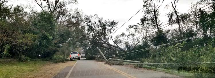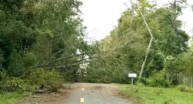 Power lines and downed trees were on virtually every road in Suwannee County. This photo was taken along 185th Street in Live Oak near Falmouth. -SVT Photo by Tami Stevenson